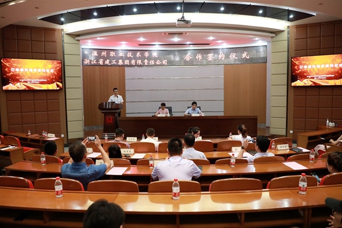 本网讯 7月20日下午,温州职业技术学院-浙江建工集团订单培养签约仪式在我校正德楼罗山厅隆重举行。副校长王志梅,浙江建工集团温州分公司党总支书记、总经理张雪清,双方相关部门负责人,建筑工程系党政领导班子和师生代表参加此次签约仪式。