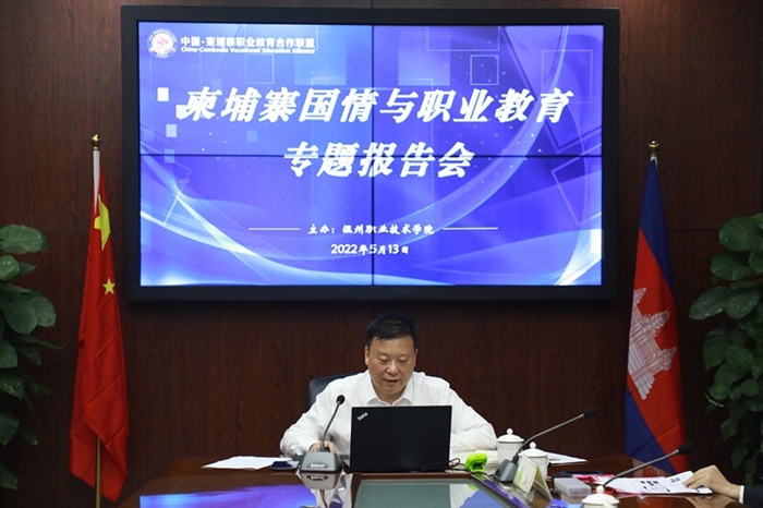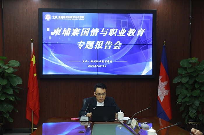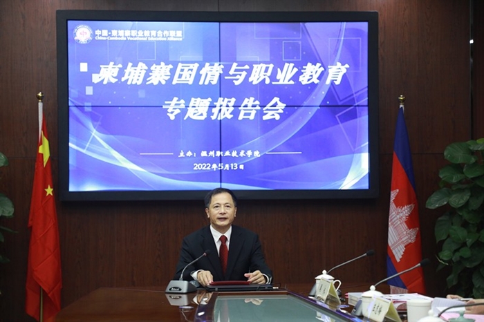 本网讯(国际交流处通讯员 金格冰)作为中柬职教合作联盟的理事长单位,5月13日上午,学校成功举办柬埔寨国情与职业教育专题报告会,会议以线上+线下方式同步进行。校长、联盟中方理事长方益权,副校长、联盟常务副理事长王志梅,亚龙智能装备股份有限公司董事长、联盟中方副理事长陈继权及相关部门负责人参加线下会议;北京外国语大学亚洲学院副院长、柬埔寨研究中心主任顾佳赟博士,中山大学国际关系学院东南亚研究所陈世伦博士,云南省社科院国际学术交流中心副主任、柬埔寨中心主任赵姝岚博士及联盟各理事单位100余名代表参加线上会议。